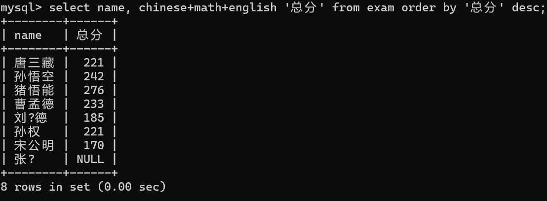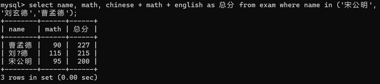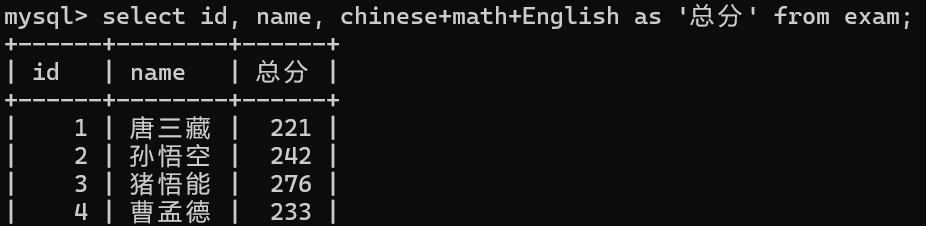 select id, name, chinese+math+English as '总分' from exam;