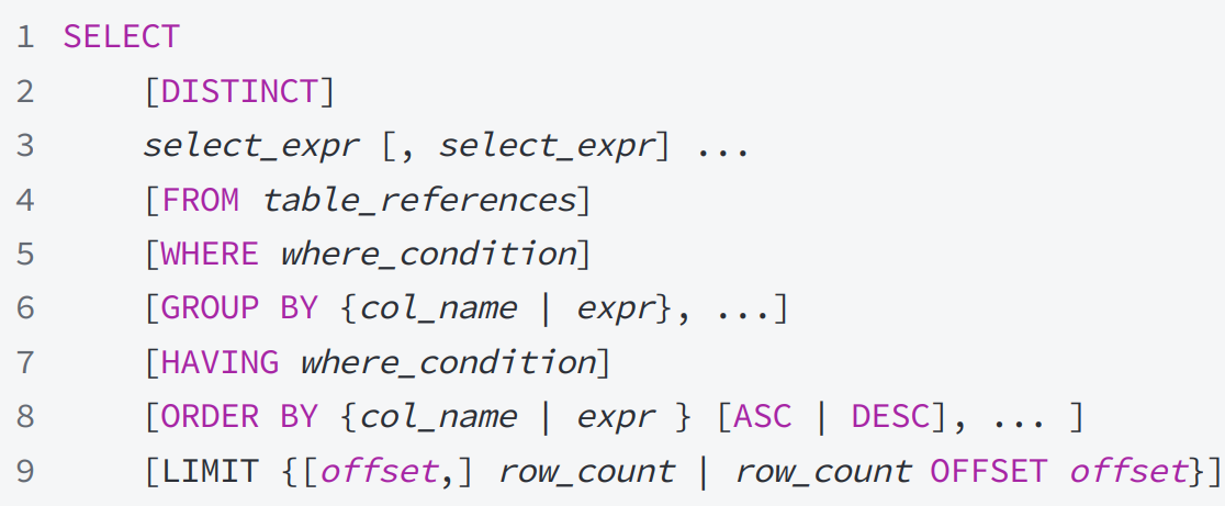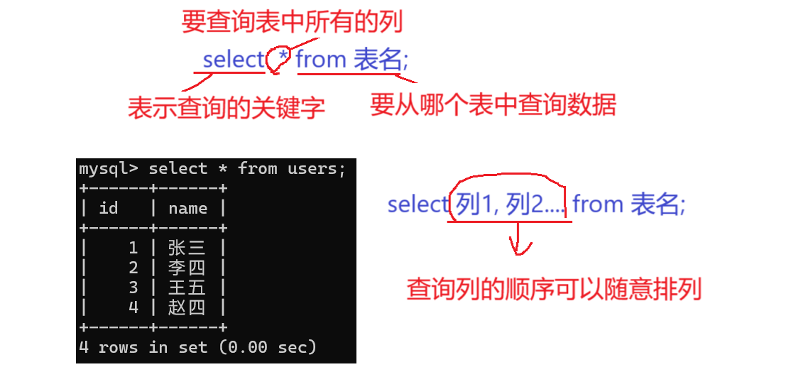 在select后面的查询列表中指定希望查询的列 ,可以是⼀个也可以是多个,中间用逗号 隔开,指定列的顺序与表结构中的列的顺序无关。