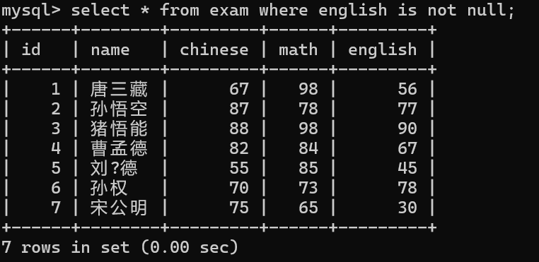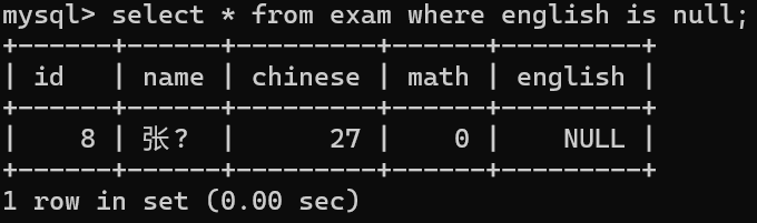 写入⼀条数据,英语成绩为NULL