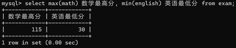 select max(math) 数学最高分, min(english) 英语最低分 from exam;