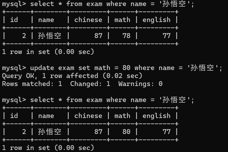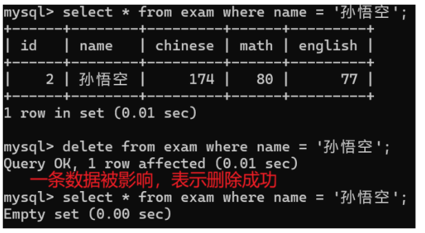 delete from exam where name = '孙悟空';