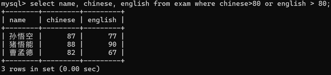 select name, chinese, english from exam where chinese>80 or english > 80;