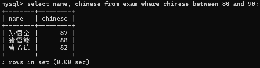 select name, chinese from exam where chinese between 80 and 90;