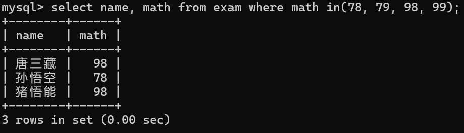 条件--math in(78, 79, 98, 99);查询列--name, math