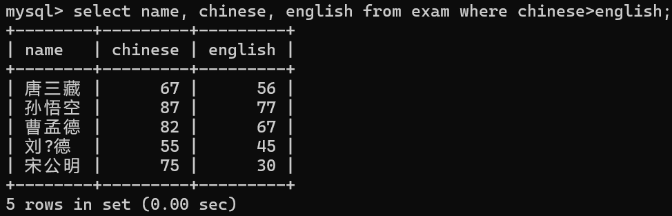 select name, chinese, english from exam where chinese>english;