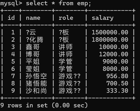 insert into emp values (9, '沙和尚', '游戏⻆⾊', 333.3);