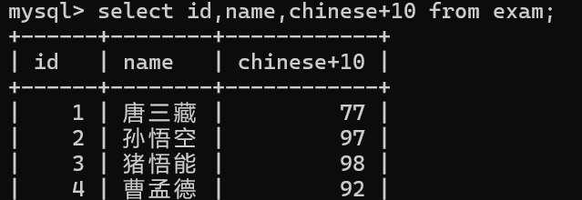 select id, name, chinese+10 from exam;
