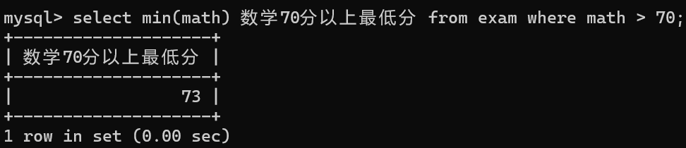 select min(math) 数学70分以上最低分 from exam where math > 70;
