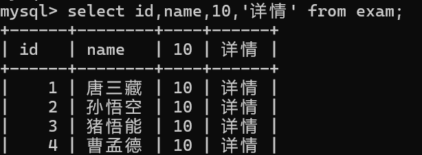 select id, name, 10, '详情' from exam;