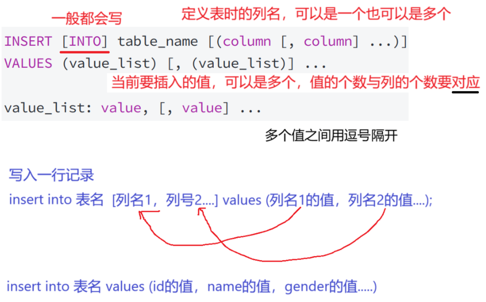 在⼀条INSERT语句中也可以指定多个value_list,用逗号隔开, 实现一次插入多行数据。