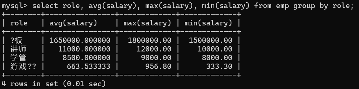 select role, avg(salary), max(salary), min(salary) from emp group by role;