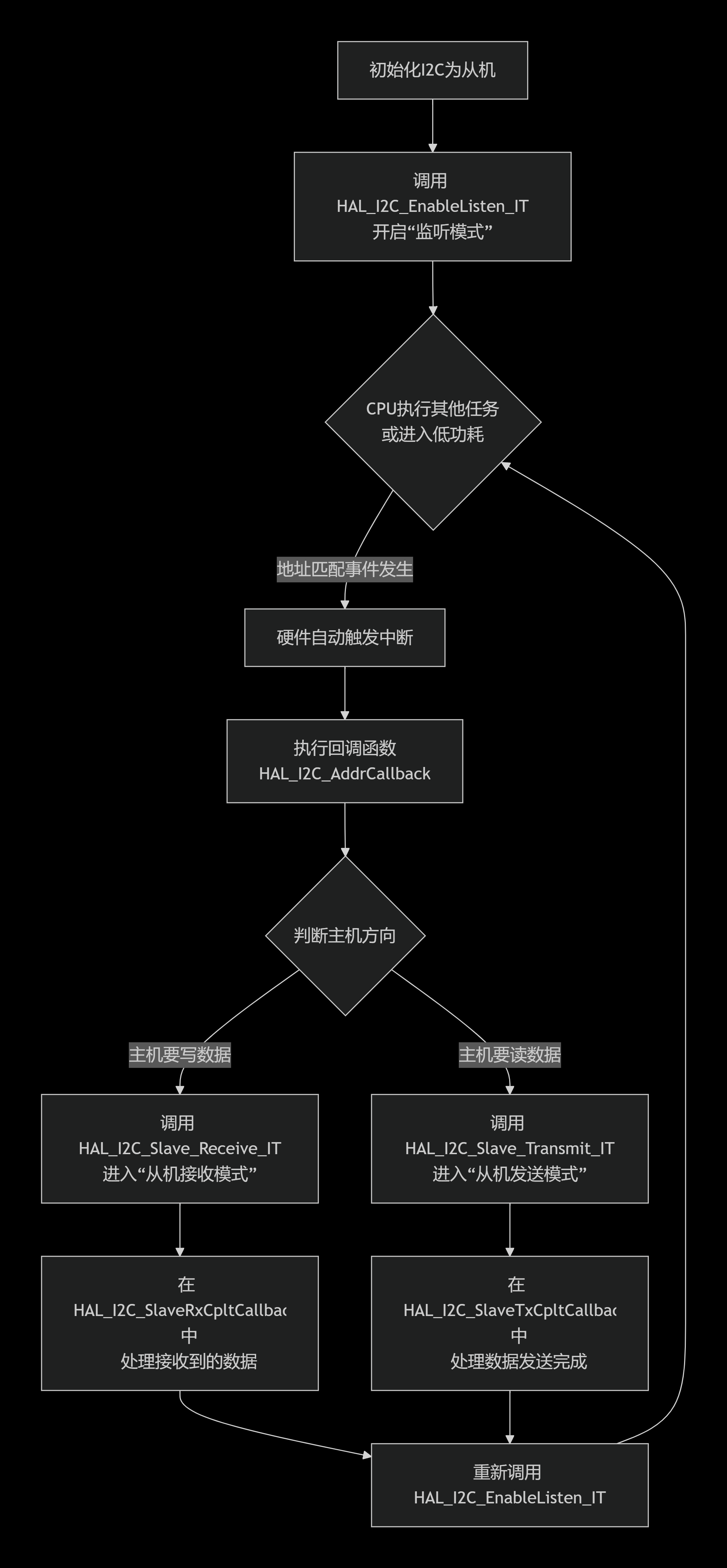 I2C_InitTypeDef结构中,有一个GeneralCallMode字段,可以设置为I2C_GENERALCALL_ENABLE。 - 当启用广播呼叫后,从机在监听模式下也会对地址0x00产生地址匹配中断。在地址回调函数中,可以通过检查匹配的地址来判断是普通寻址还是广播呼叫。