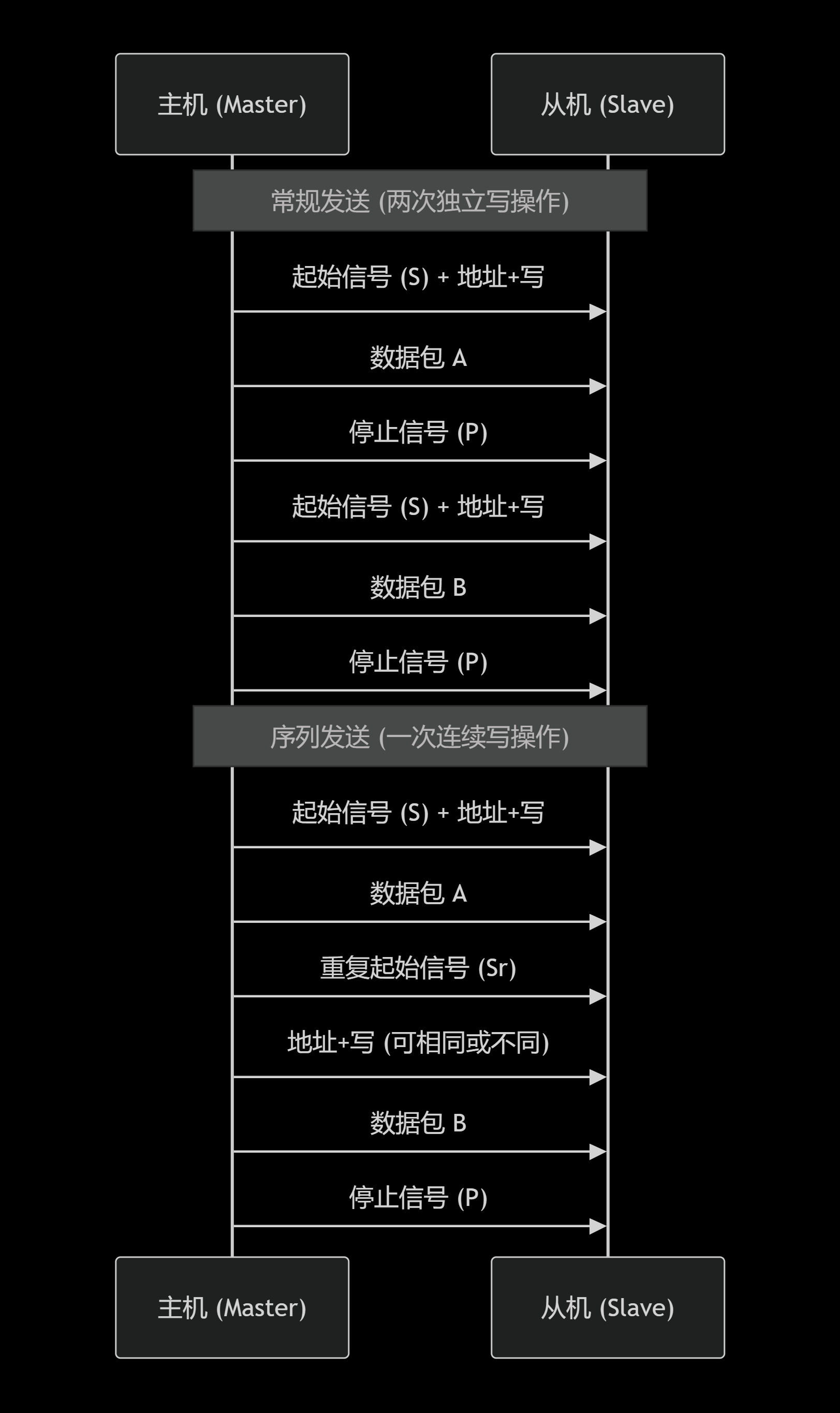 0x00是协议保留地址,严禁 将任何从机设备的独立地址设置为0x00,否则会造成寻址混乱。 - 协议定义 :广播呼叫的具体数据格式(尤其是第一个命令字节的含义)没有统一的国际标准,通常由系统设计者或设备制造商自行定义。在设计和实现时,需要查阅相关设备的数据手册或制定统一的系统通信协议。