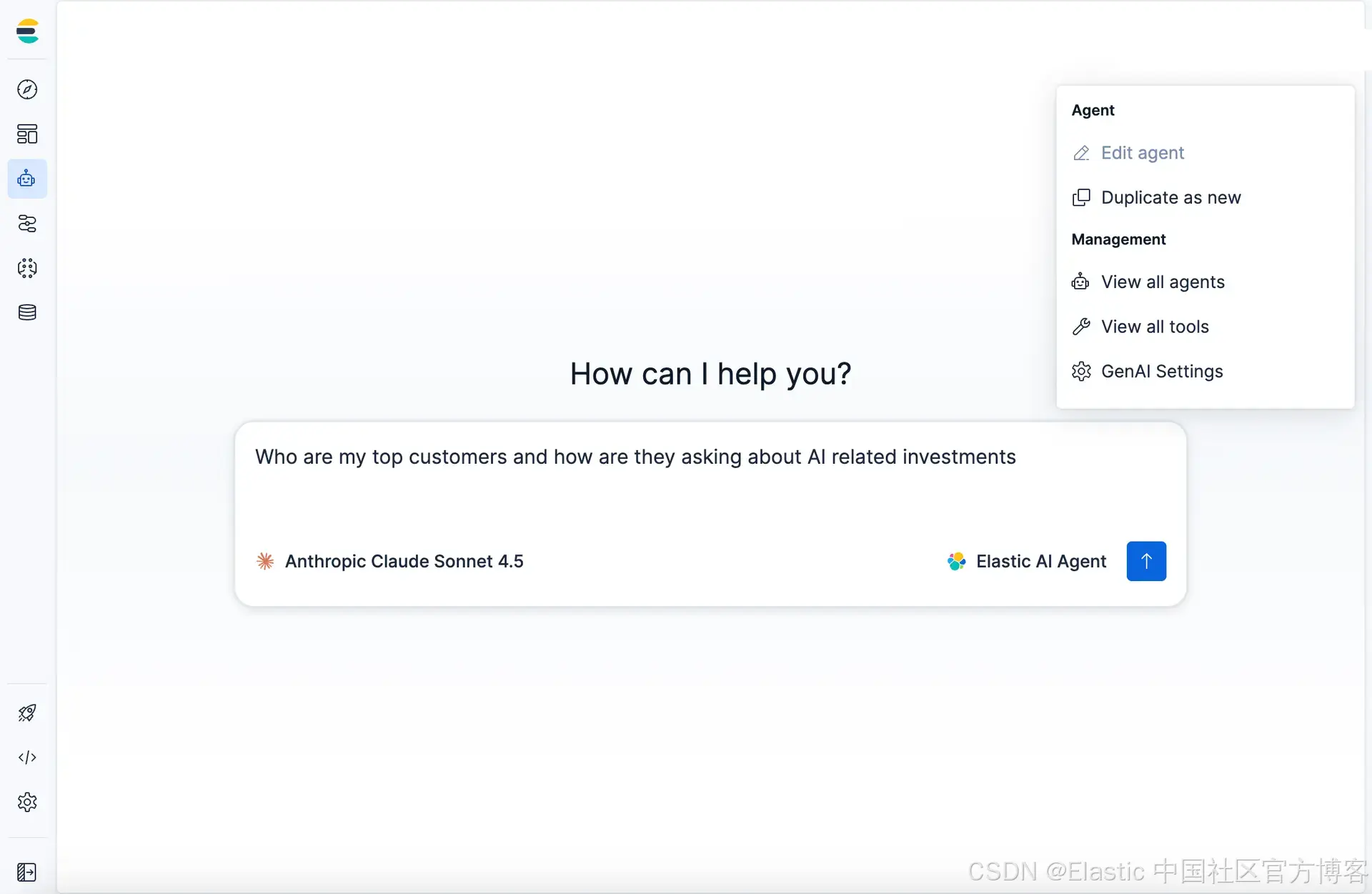 - 立即使用内置的对话式 agent,对 Elasticsearch 中的任意数据进行问答、分析和调查。