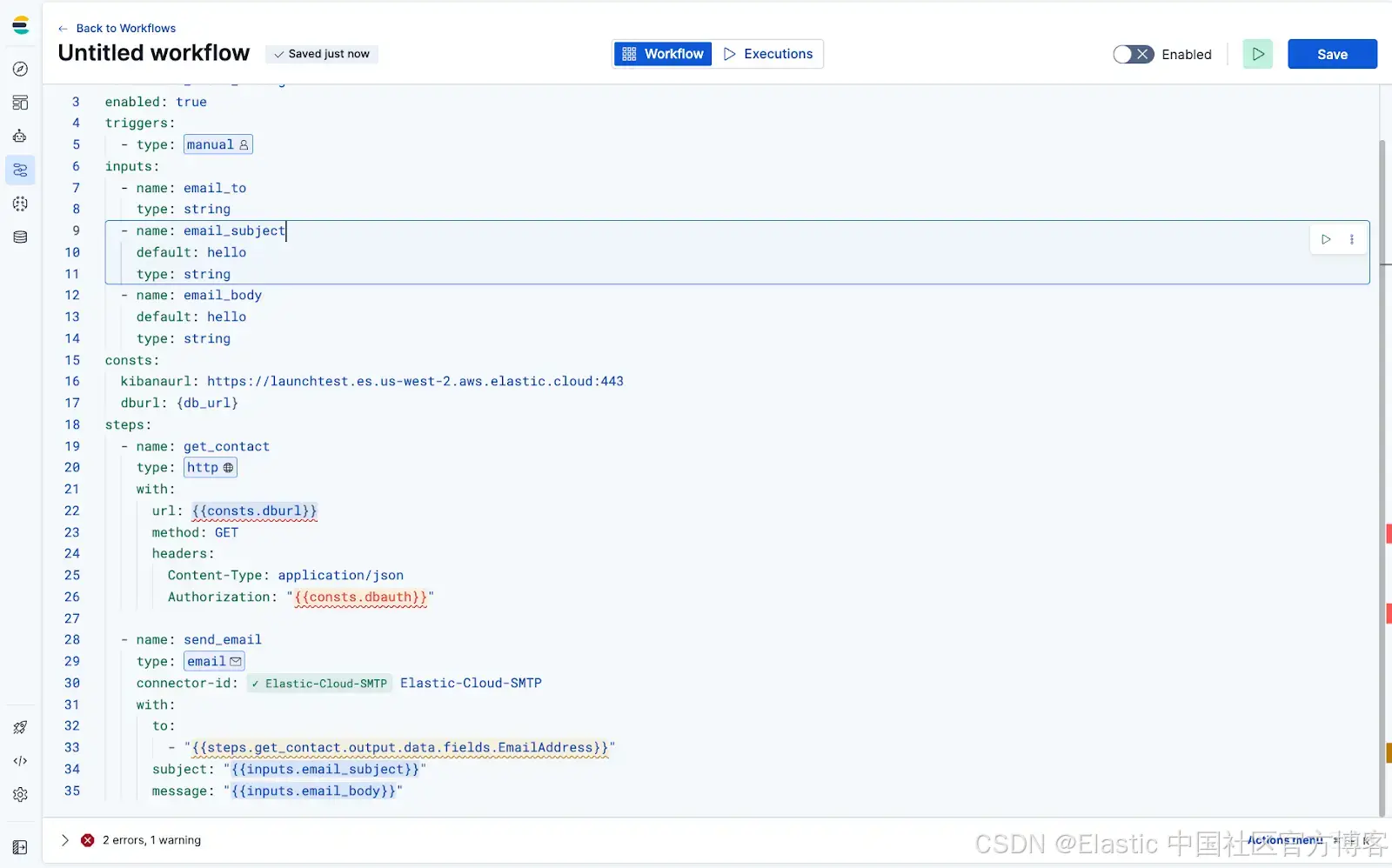 虽然 AI agents 能够为复杂任务提供推理能力,但大量自动化依赖于可靠执行规则驱动的操作,以实施特定业务逻辑。Elastic Workflows 提供了一种简单、声明式的方式,用于编排内部和外部 system 以执行操作、收集上下文或数据,并将其整合为 agents 的一部分。工作流以 YAML 定义,完全可组合,可根据任务需求简化或复杂化。这为 agents 在 Elasticsearch 平台及其解决方案,以及第三方应用程序上高效执行操作提供了途径。