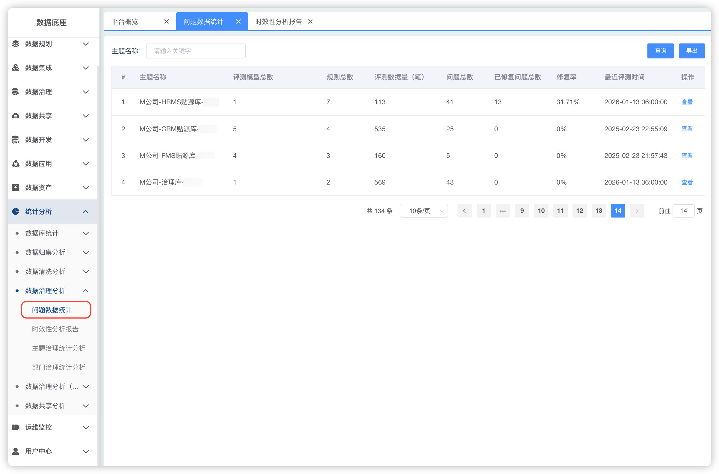 数据治理分析模块新增2大核心功能:「问题数据统计」、「时效性分析报告」模块,助力全面洞察数据质量状况,为决策提供数据支撑。