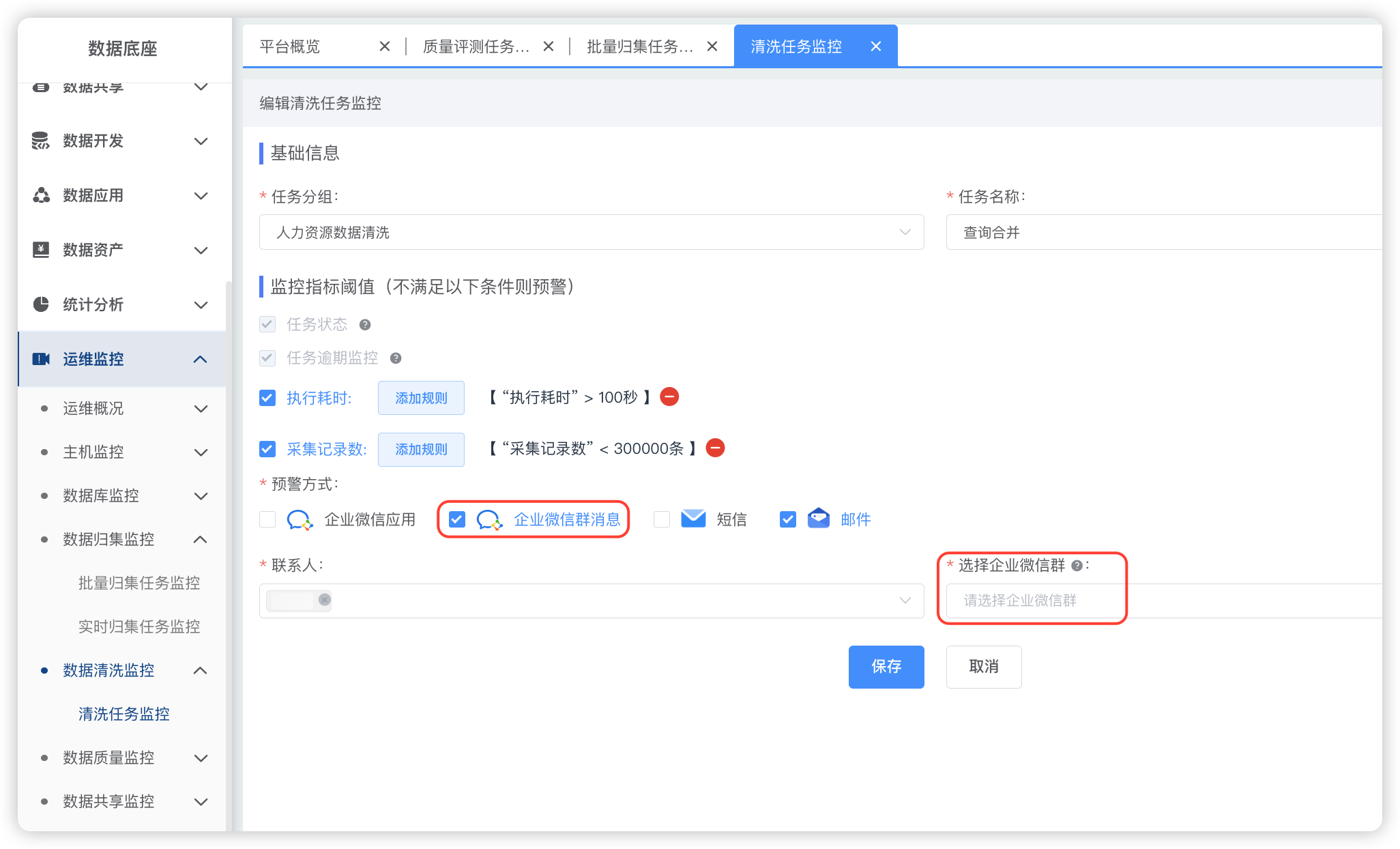 扩展预警渠道:在数据归集监控、数据清洗监控、数据共享监控模块中,增加企业群消息预警功能,实现异常信息及时同步。