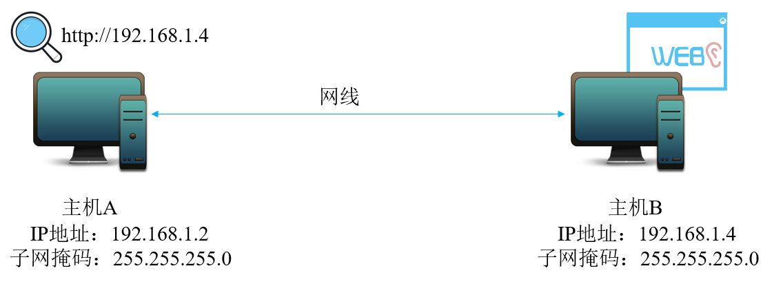 主机A 与主机B直接通过网线相连,形成最小的局域网(Local Area Network,LAN)。