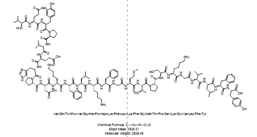 - 稳定性 :-20℃干燥避光条件下可保存 24 个月;水溶液在 4℃下稳定 20 天,37℃生理条件下半衰期约12 小时 ,为中长链线性肽中稳定性优异的类型;肽链中 Lys 位点对胰蛋白酶有一定敏感性,但 Pro 的高频出现(肽链弯折)阻碍了蛋白酶的底物结合,显著提升抗酶解能力;Met 的硫醚基、Tyr 的酚羟基为主要氧化位点,Asp/Glu 的羧基与 Lys/His 的碱性基团可形成分子内盐桥,增强结构稳定性;His 的咪唑基为 pH 敏感型基团,极端 pH 下易发生质子化状态改变,但不影响肽链完整性;体内半衰期约 6-8 小时,主要在肝脏被肽酶水解为小肽与氨基酸,无组织累积;长期储存需避光、隔绝空气,分装冻存避免反复冻融,4℃短期使用无需添加蛋白酶抑制剂 / 抗氧化剂。