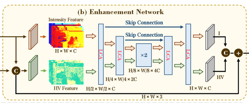 这个双分支增强网络,其整个流程架构就是把I和HV图都送入一个双路径U-Net一个处理光照一个处理颜色,然后在每一层的U-Net引入一个LCA模块,这个LCA模块是一个交叉注意力模块,他让色彩跟光照有联系,光照和色彩有联系