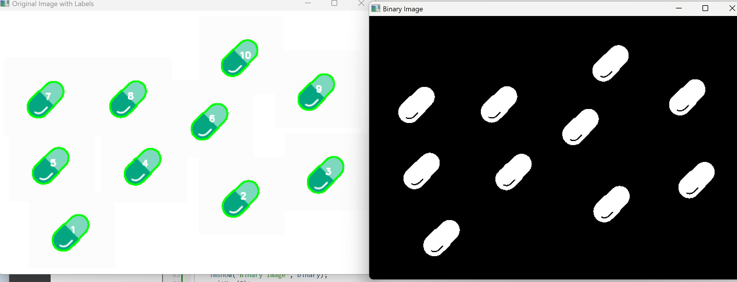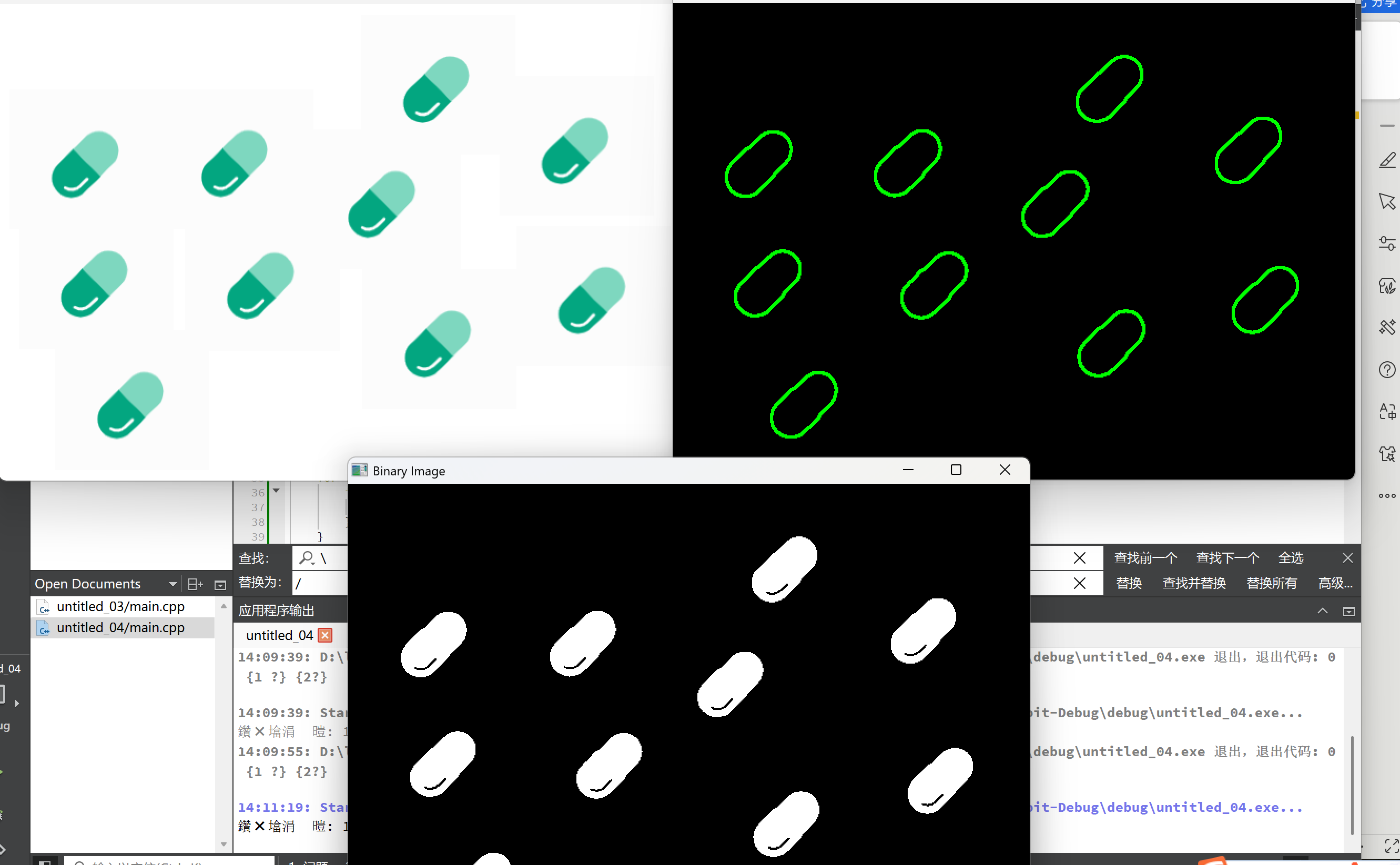 输出与显示:输出检测到的药片个数,并使用imshow函数显示原始图像、二值化图像和绘制轮廓后的图像,waitKey(0)等待按键输入,保持图像窗口显示。