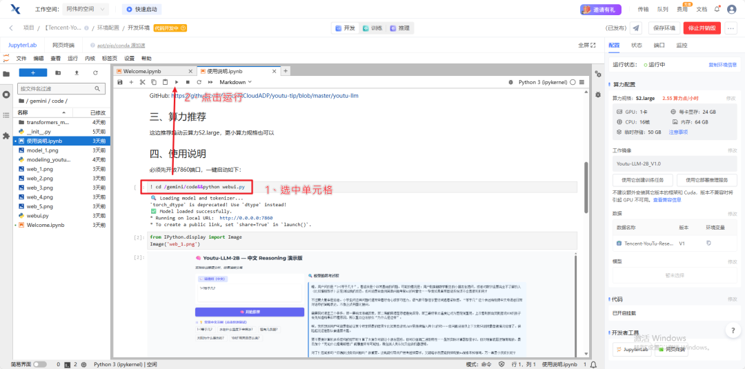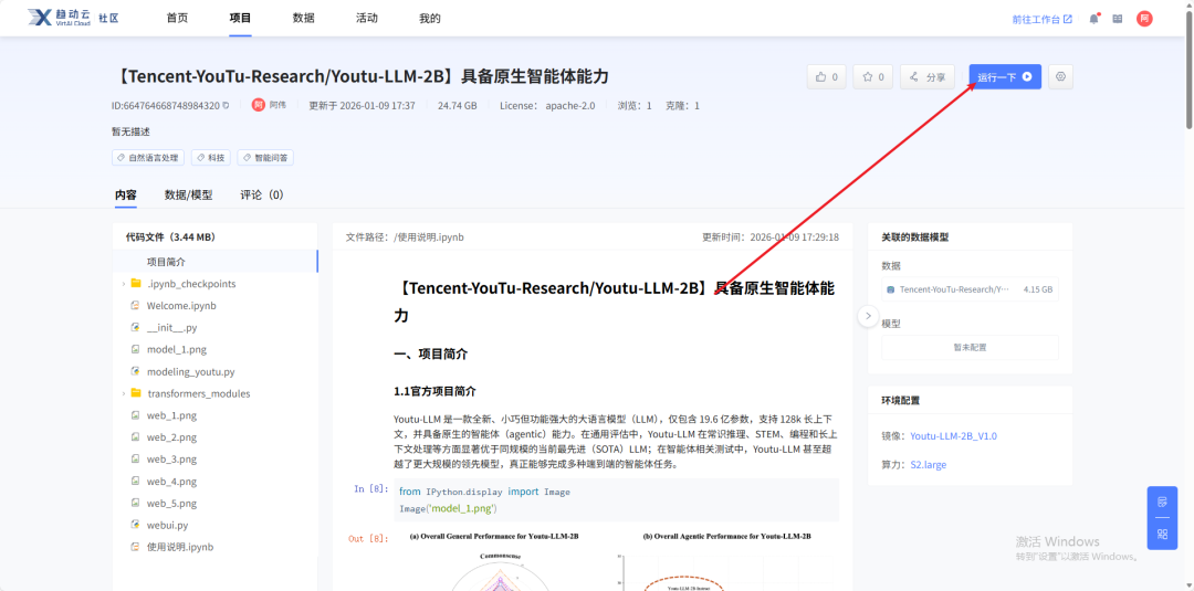 进入【Tencent-YouTu-Research/Youtu-LLM-2B】项目主页中,点击运行一下,将项目一键克隆至工作空间,『社区项目』推荐适用的算力规格,可以直接立即运行,省去个人下载数据、模型和计算算力的大量准备时间。