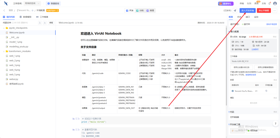 配置完成,点击进入开发环境,根据主页项目介绍进行部署。
