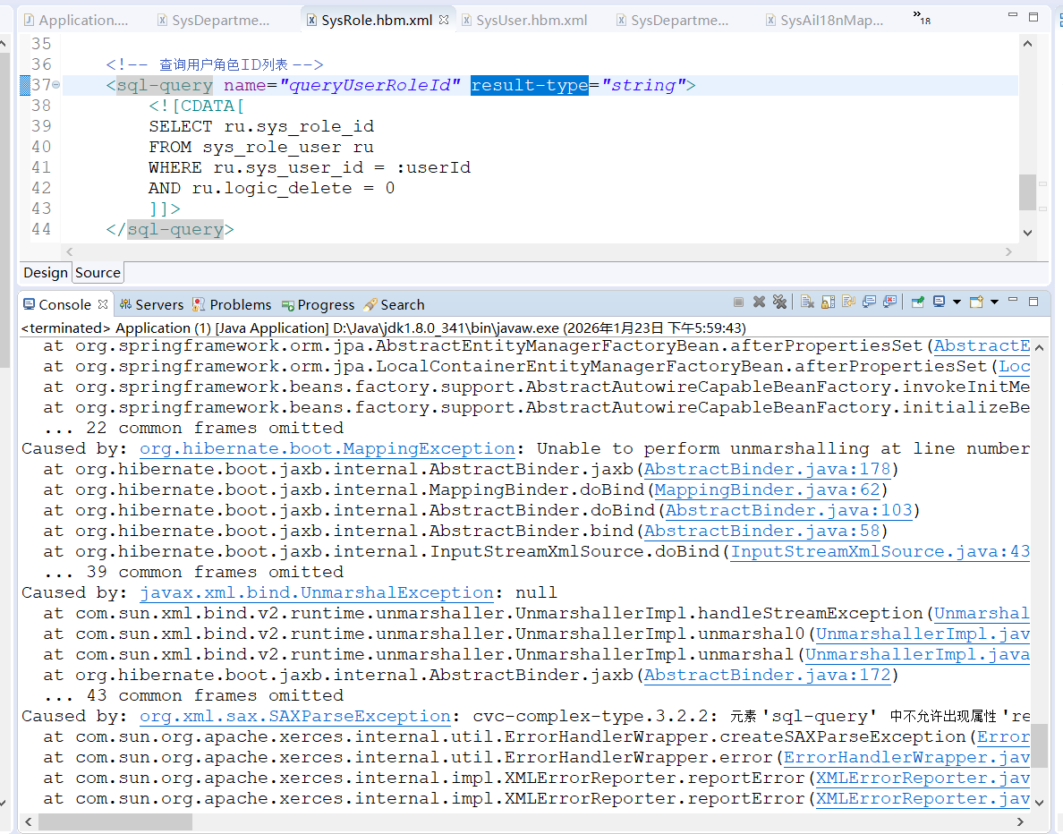 Caused by: org.hibernate.boot.MappingException: Unable to perform unmarshalling at line number 37 and column 60. Message: cvc-complex-type.3.2.2: 元素 'sql-query' 中不允许出现属性 'result-type'。 : origin(file:/E:/Workspace_zwf/Further/target/classes/hibernate/SysRole.hbm.xml)