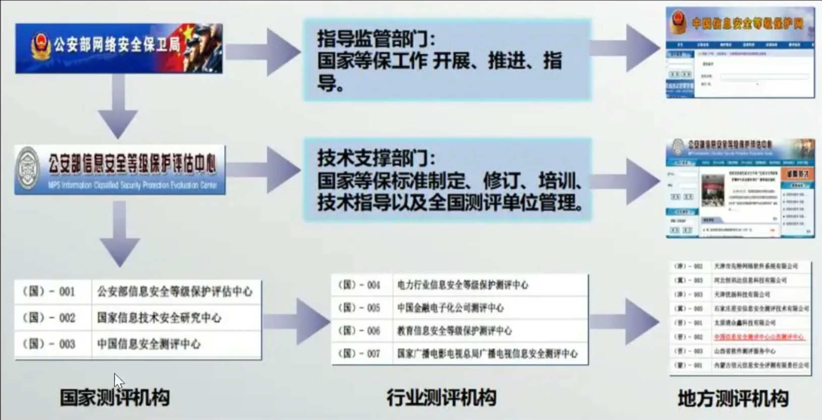 技术支撑部门:包括公安部信息安全等级保护评估中心(MPS Information Classified Security ProtectionEvaluation Center),以及多个国家级、行业级和地方级的测评机构。这些部门主要负责制定、修订国家标准和技术指南,进行培训和技术指导,以及管理全国测评单位。