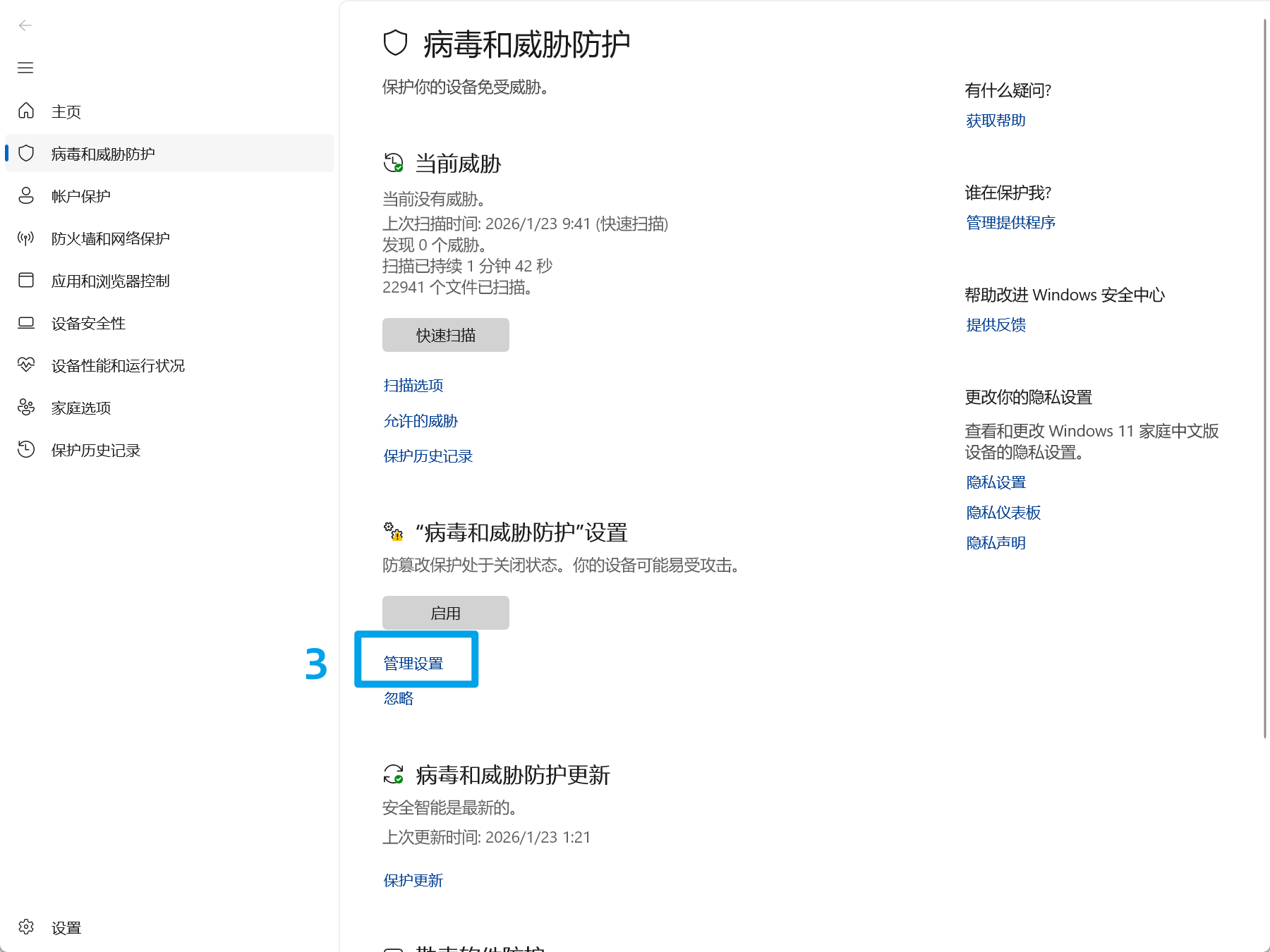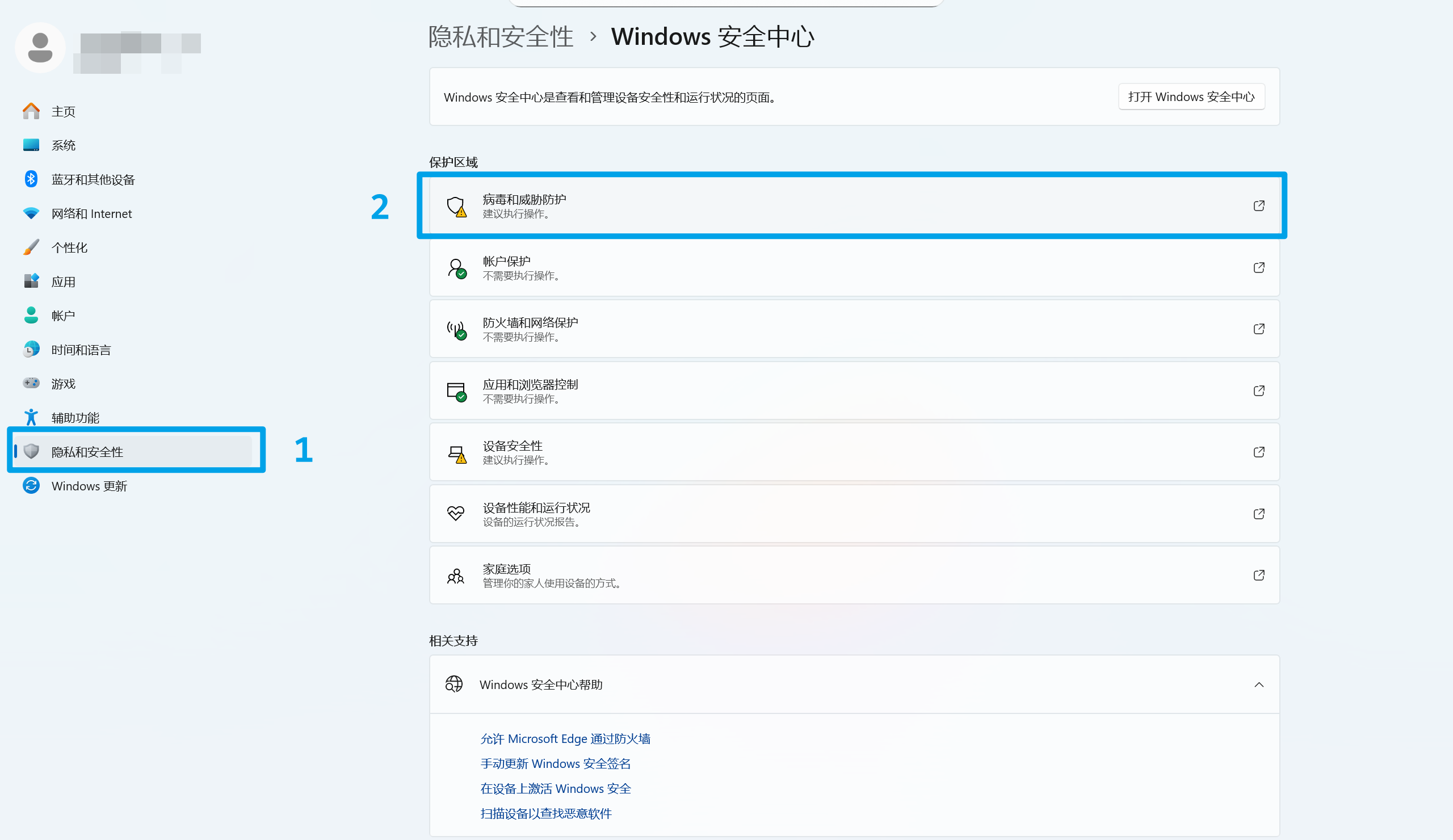 1.在设置中选择"隐私和安全性",再选择"病毒和威胁防护"