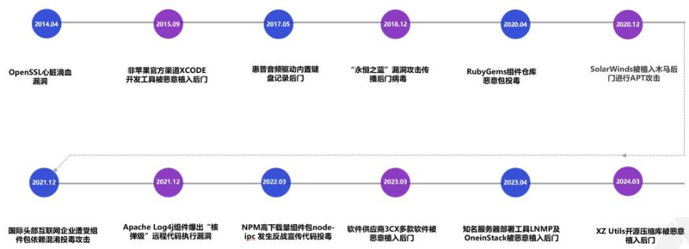 从2014年的OpenSSL心脏滴血漏洞,到2020年的SolarWinds供应链攻击,再到2023年的Log4j2漏洞、XZ事件......软件供应链安全事件频发,影响范围从底层组件延伸到上层应用,攻击手法从漏洞利用发展到代码投毒。