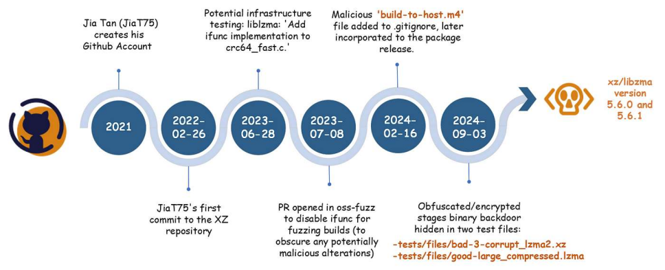2023年底,广泛使用的开源压缩工具XZ-Utils被恶意投毒。攻击者通过长期潜伏、提交看似正常的代码,最终植入后门,影响多个Linux发行版。