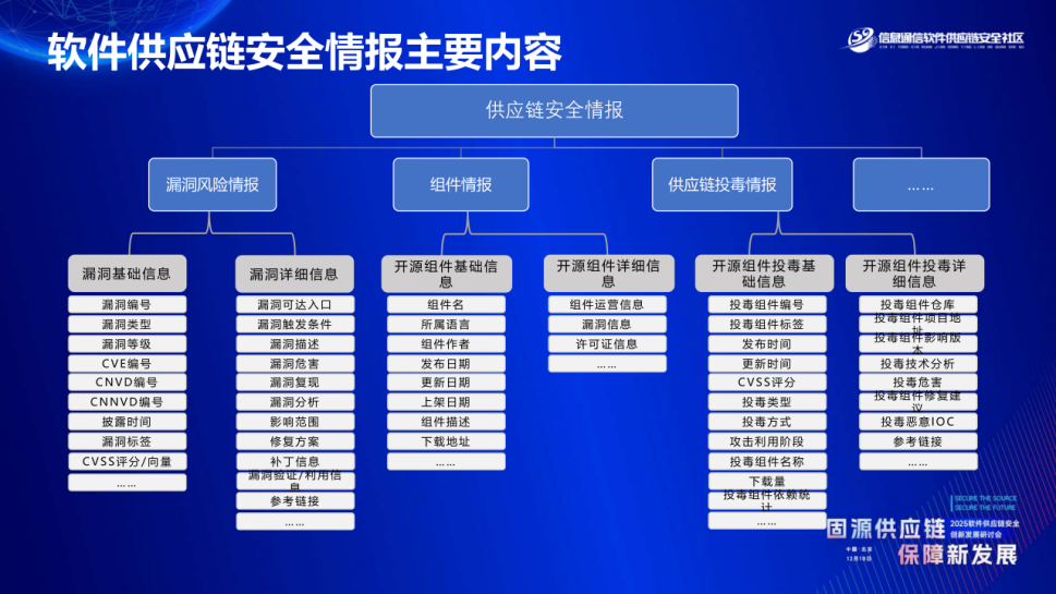 软件供应链安全情报并非单一维度的信息,而是一个多维度、全覆盖的体系,主要包括三大核心类型: 漏洞风险情报、组件情报、供应链投毒情报。