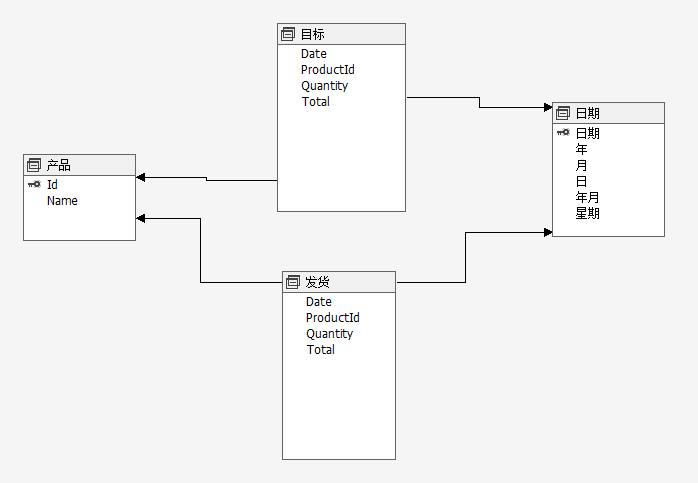 目标和发货里的产品和日期字段分别与产品表和日期表进行关联,结果如下图。