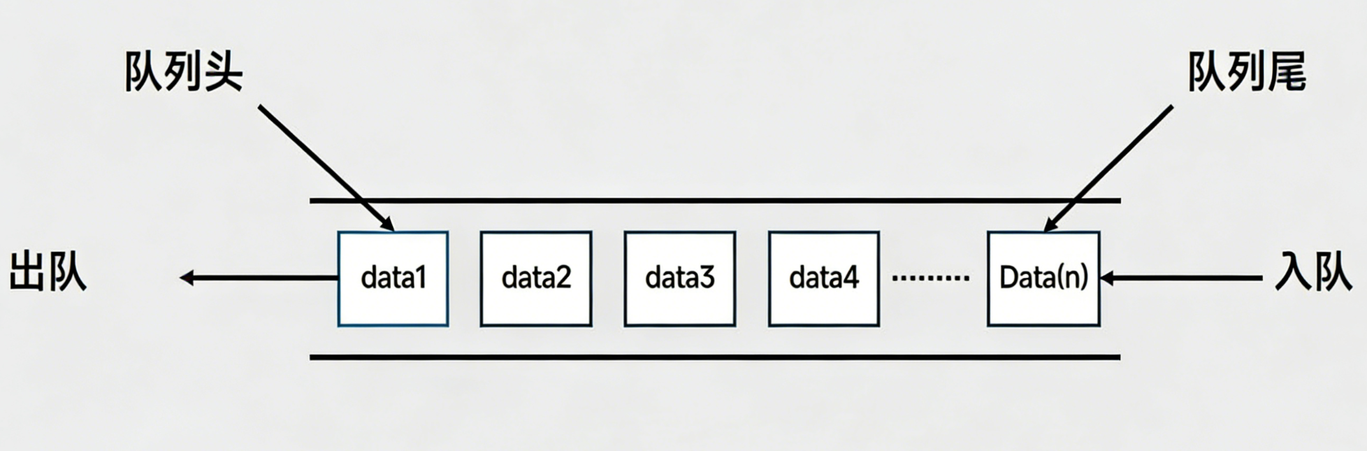 - 队头(Front):允许删除的一端,存放最早进入队列的元素