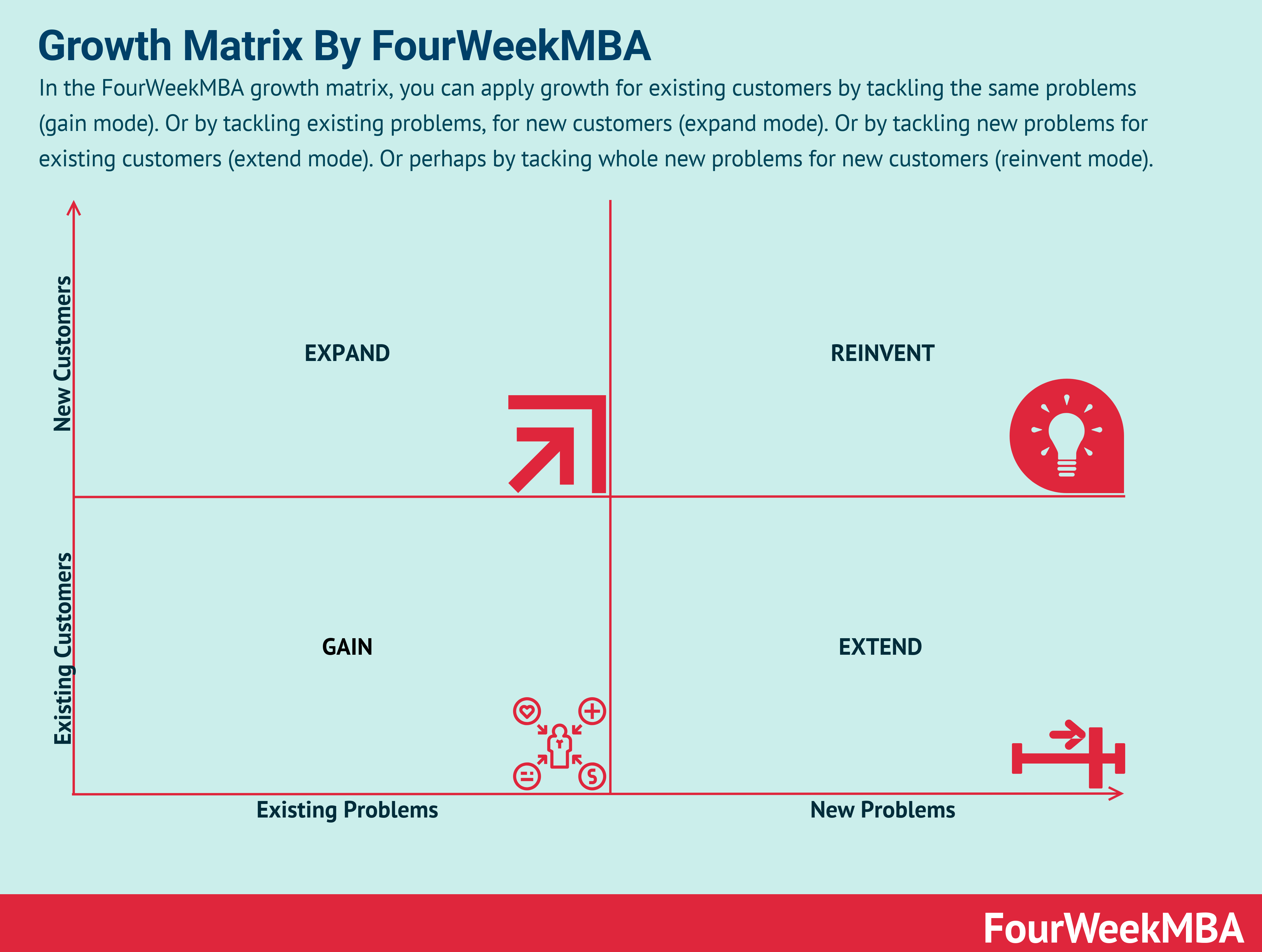 In the FourWeekMBA growth matrix, you can apply growth for existing customers by tackling the same problems (gain mode). Or by tackling existing problems, for new customers (expand mode). Or by tackling new problems for existing customers (extend mode). Or perhaps by tackling whole new problems for new customers (reinvent mode).