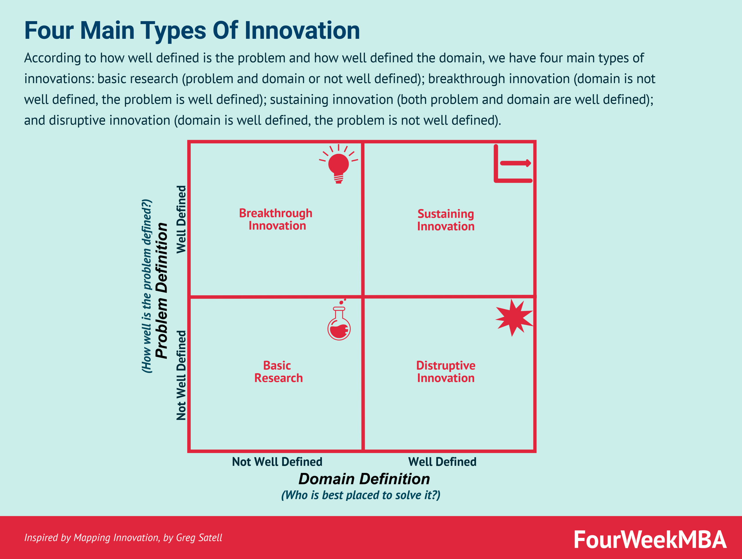 According to how well defined is the problem and how well defined the domain, we have four main types of innovations: basic research (problem and domain or not well defined); breakthrough innovation (domain is not well defined, the problem is well defined); sustaining innovation (both problem and domain are well defined); and disruptive innovation (domain is well defined, the problem is not well defined).