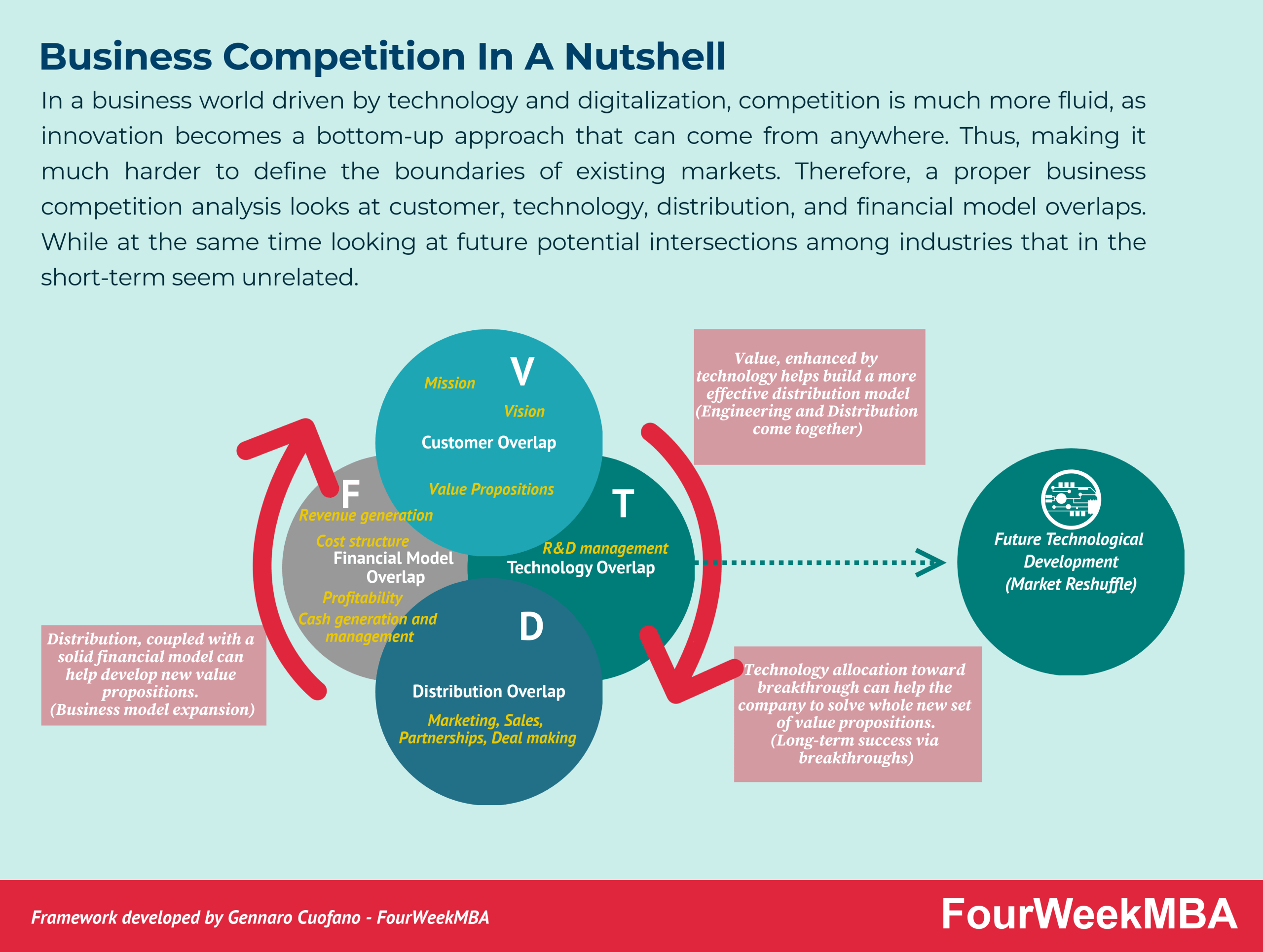 In a business world driven by technology and digitalization, competition is much more fluid, as innovation becomes a bottom-up approach that can come from anywhere. Thus, making it much harder to define the boundaries of existing markets. Therefore, a proper business competition analysis looks at customer, technology, distribution, and financial model overlaps. While at the same time looking at future potential intersections among industries that in the short-term seem unrelated.
