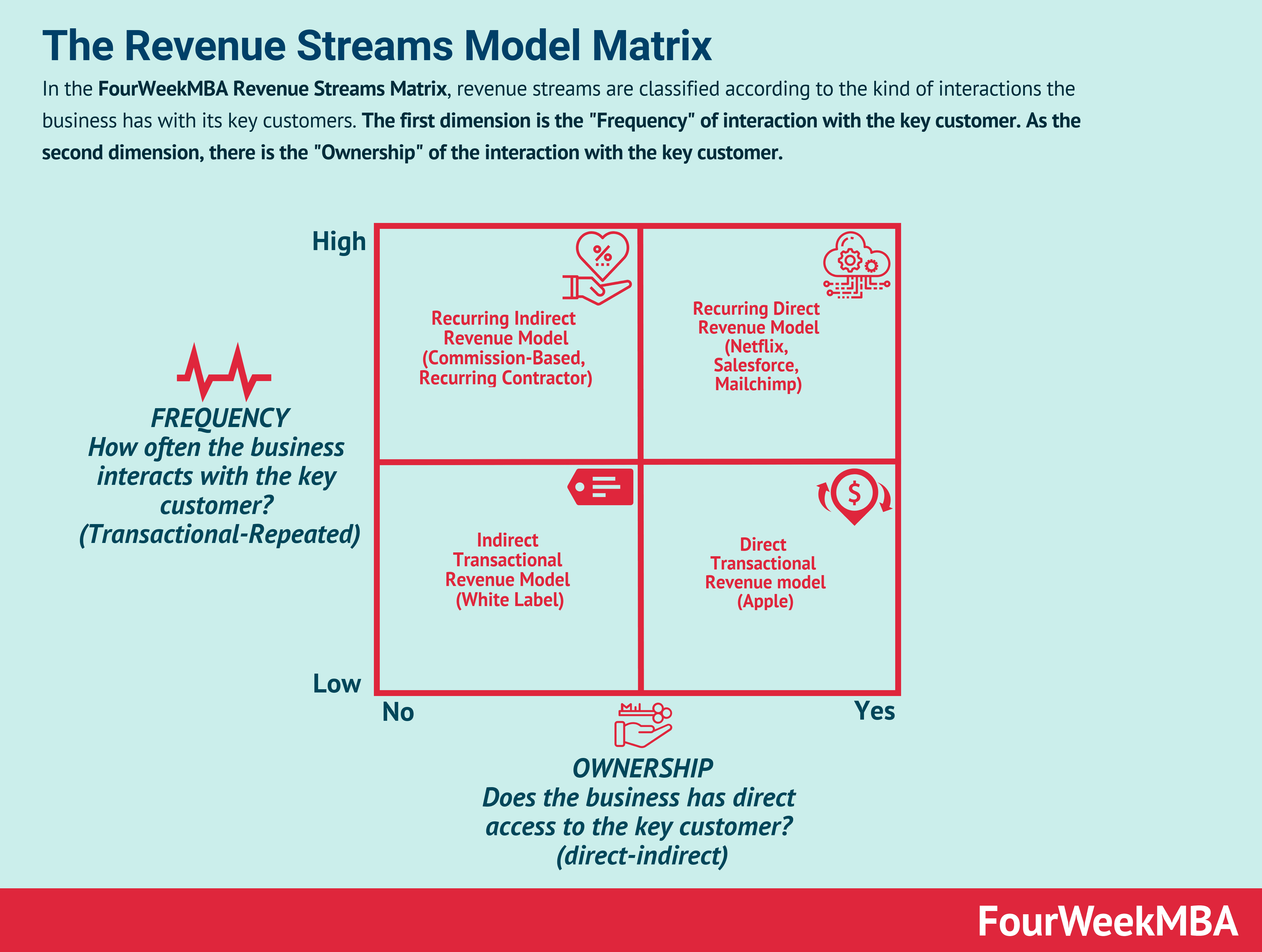 In the FourWeekMBA Revenue Streams Matrix, revenue streams are classified according to the kind of interactions the business has with its key customers. The first dimension is the "Frequency" of interaction with the key customer. As the second dimension, there is the "Ownership" of the interaction with the key customer.