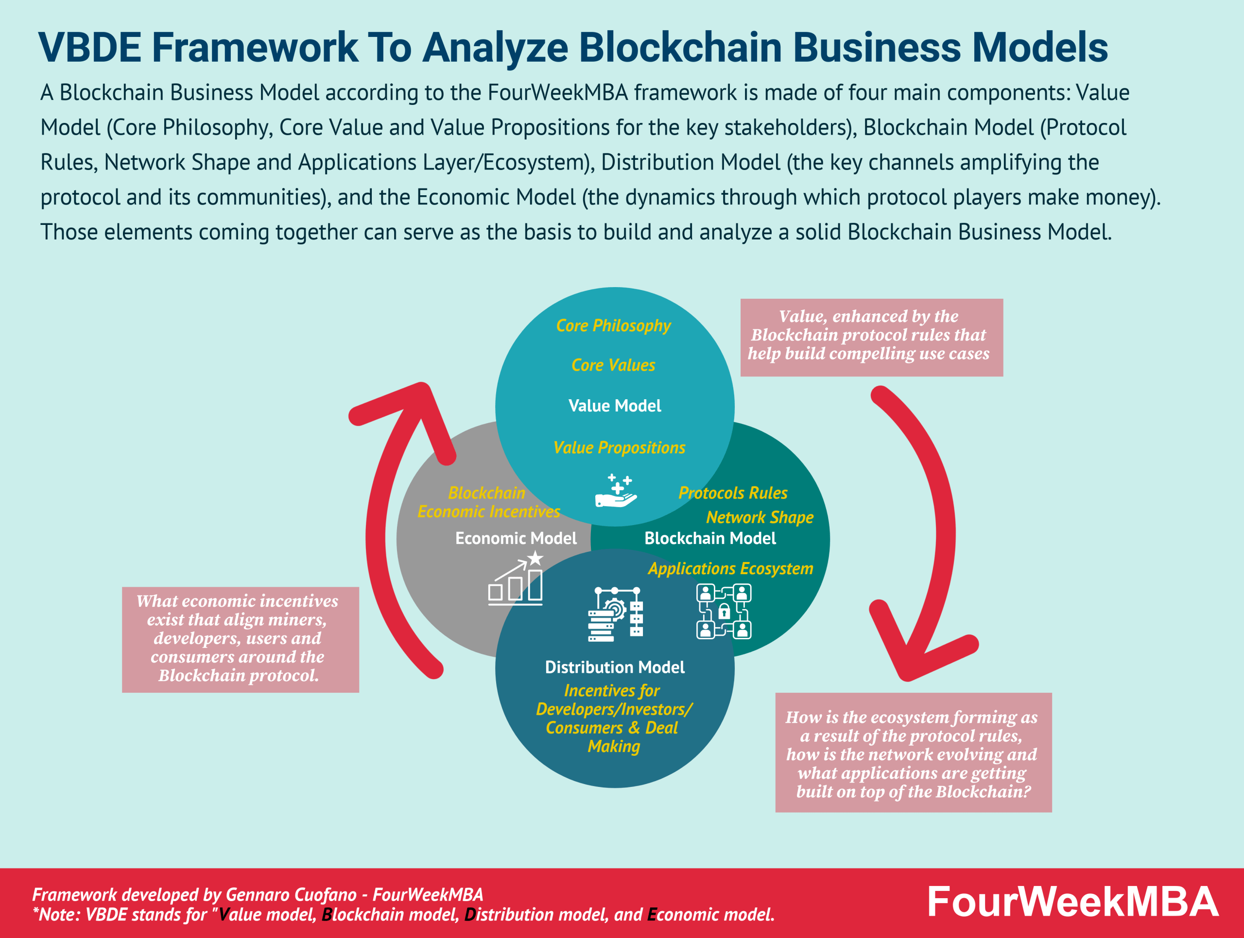 A Blockchain Business Model according to the FourWeekMBA framework is made of four main components: Value Model (Core Philosophy, Core Values and Value Propositions for the key stakeholders), Blockchain Model (Protocol Rules, Network Shape and Applications Layer/Ecosystem), Distribution Model (the key channels amplifying the protocol and its communities), and the Economic Model (the dynamics/incentives through which protocol players make money). Those elements coming together can serve as the basis to build and analyze a solid Blockchain Business Model.