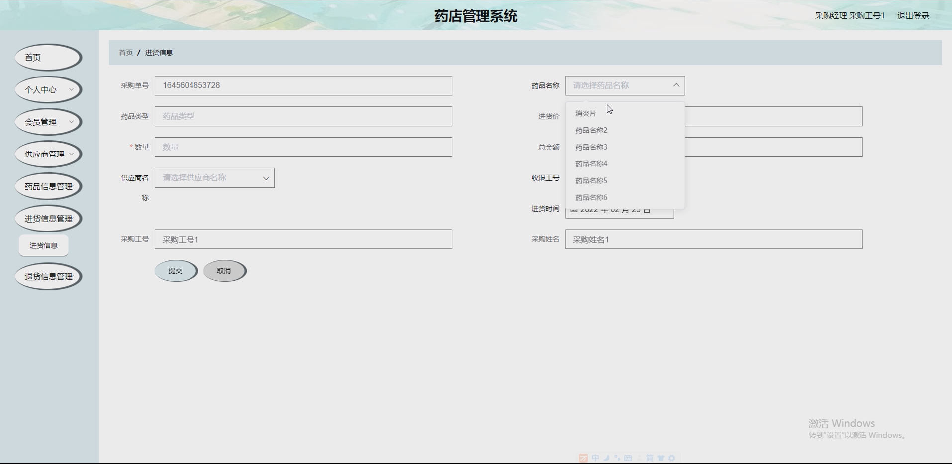 药品采购:管理员与授权员工提交药品采购申请,填写采购药品名称、规格、数量、供应商等信息,审核通过后生成采购订单,可查看采购记录、采购进度,规范采购流程,避免库存短缺。