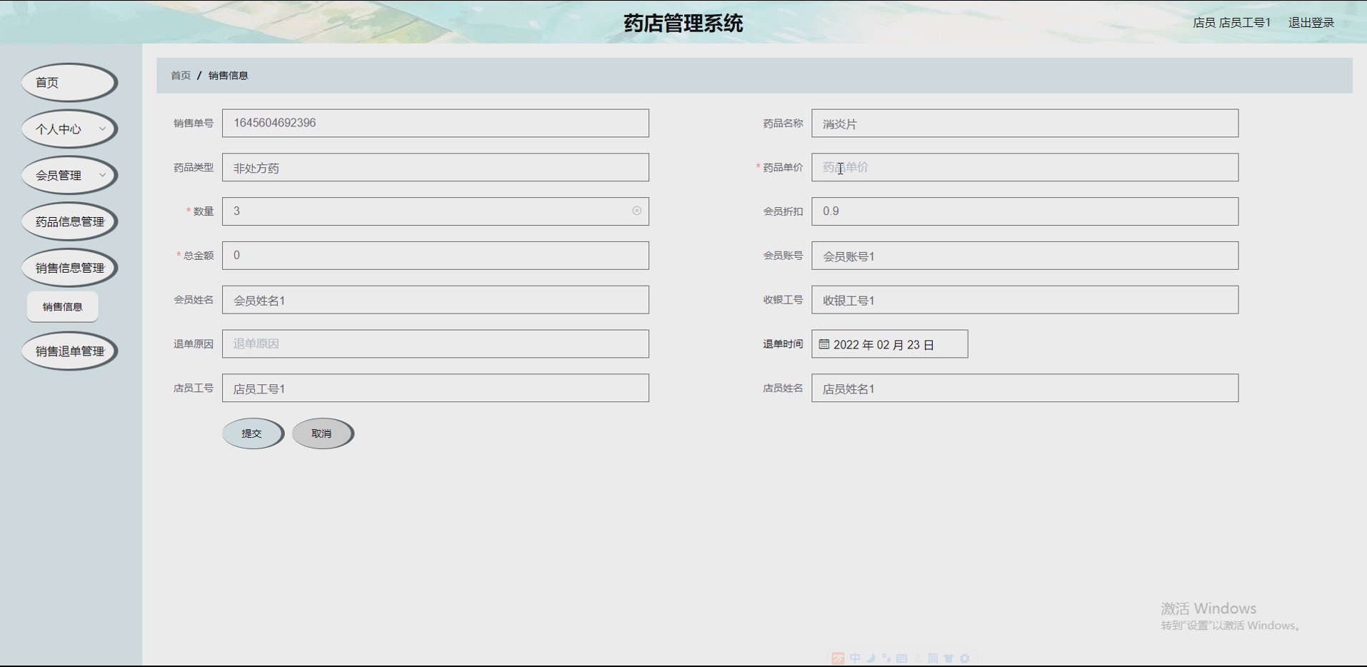 药品销售:员工录入销售药品信息(药品名称、规格、数量、销售单价、购买人信息等),系统自动计算销售金额,同步扣减药品库存,生成销售记录,支持销售记录查询、对账,简化销售流程。