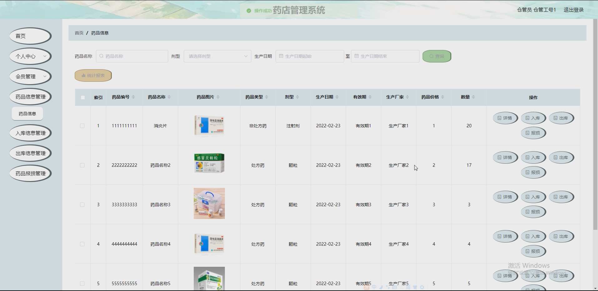 系统项目功能:员工,药品类型,药品信息,药品入库,药品采购,药品销售,药品出库