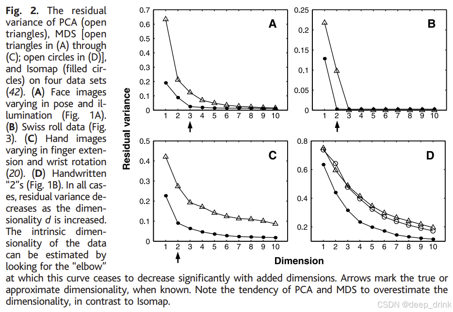 - 对比:传统线性方法 PCA 和 MDS(空心点)无法发现这种非线性结构,往往高估数据的维度,误差下降缓慢。