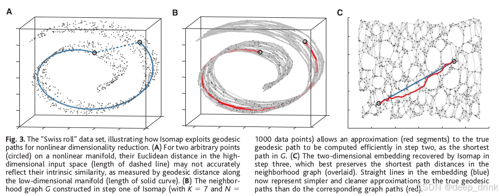 Isomap 的算法流程极其简洁,主要分为三步。结合图 3(瑞士卷展开过程)进行讲解: