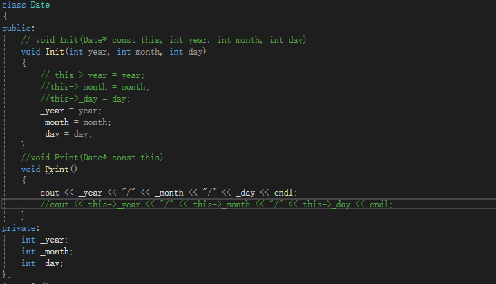 注释的调用才是真正的函数调用,每个函数的第一个参数都是this指针,由编译器将对象的指针传过去并且隐藏。所以Print函数能知道是哪个对象在调用自己。函数中的成员变量都是通过this指针访问的。