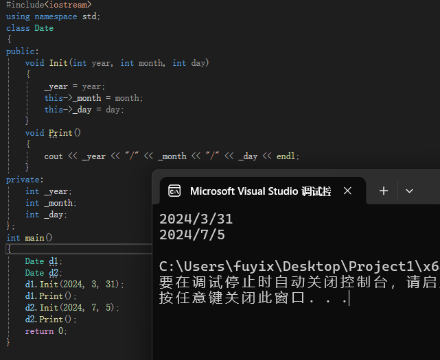 如上图有一个日期类,我实例化出了两个对象并且都调用了init和Print函数。有一个问题:在2.2中我们知道所有对象调用的都是同一份成员函数,那请问Print函数并没有传任何参数,为什么两个对象调用Print函数的结果不同呢?Print函数怎么知道每个对象的成员变量的大小呢?
