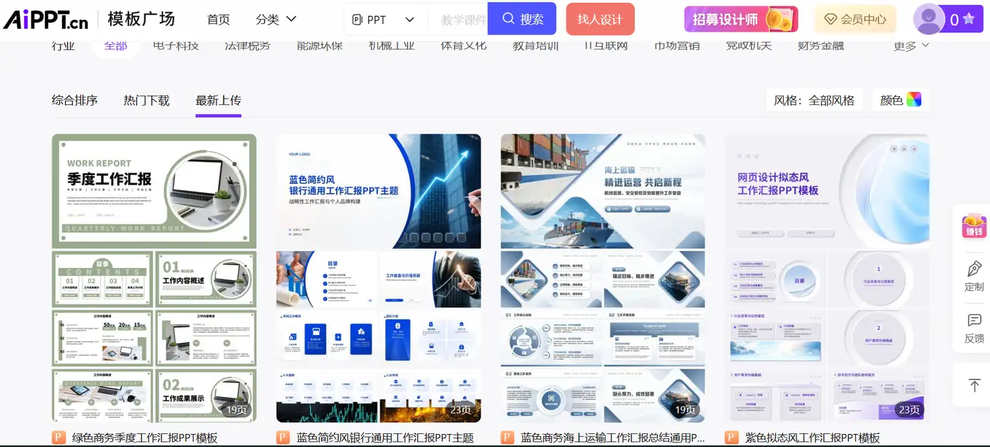 如果只是想下载PPT模板,AIPPT也是个不错的选择。它站内汇集了20w+编辑模板,有关PPT的模板。格主题也十分全面,比如科技互联网,金融,校园,宣传等,拿来做工作总结汇报非常合适。借助AIPPT提供的模板,不仅可以快速搞定工作总结汇报,还能明显提升PPT的设计质量,让新手也能搞定高质量设计。
