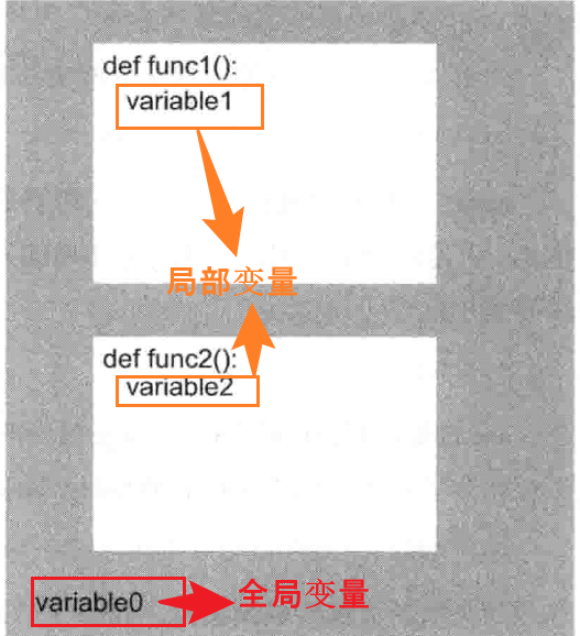 2、图中,func1()和func2()函数分别为两个作用域,func1()中定义的函数variable1只在func1()作用域中生效,func2()中定义的函数variable2只在func2()作用域中生效,variable1和variable2为局部变量。func2()不能访问variable1, func1()不能访问variable2。