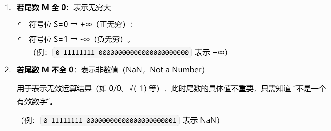 此时用于表示无穷大(∞) 或非数值(NaN),规则如下: